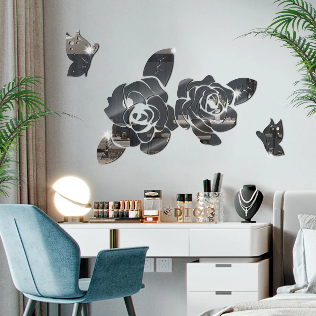 나비 3D 장미 거울 벽 스티커 자체 접착 아크릴 거울 사랑스러운