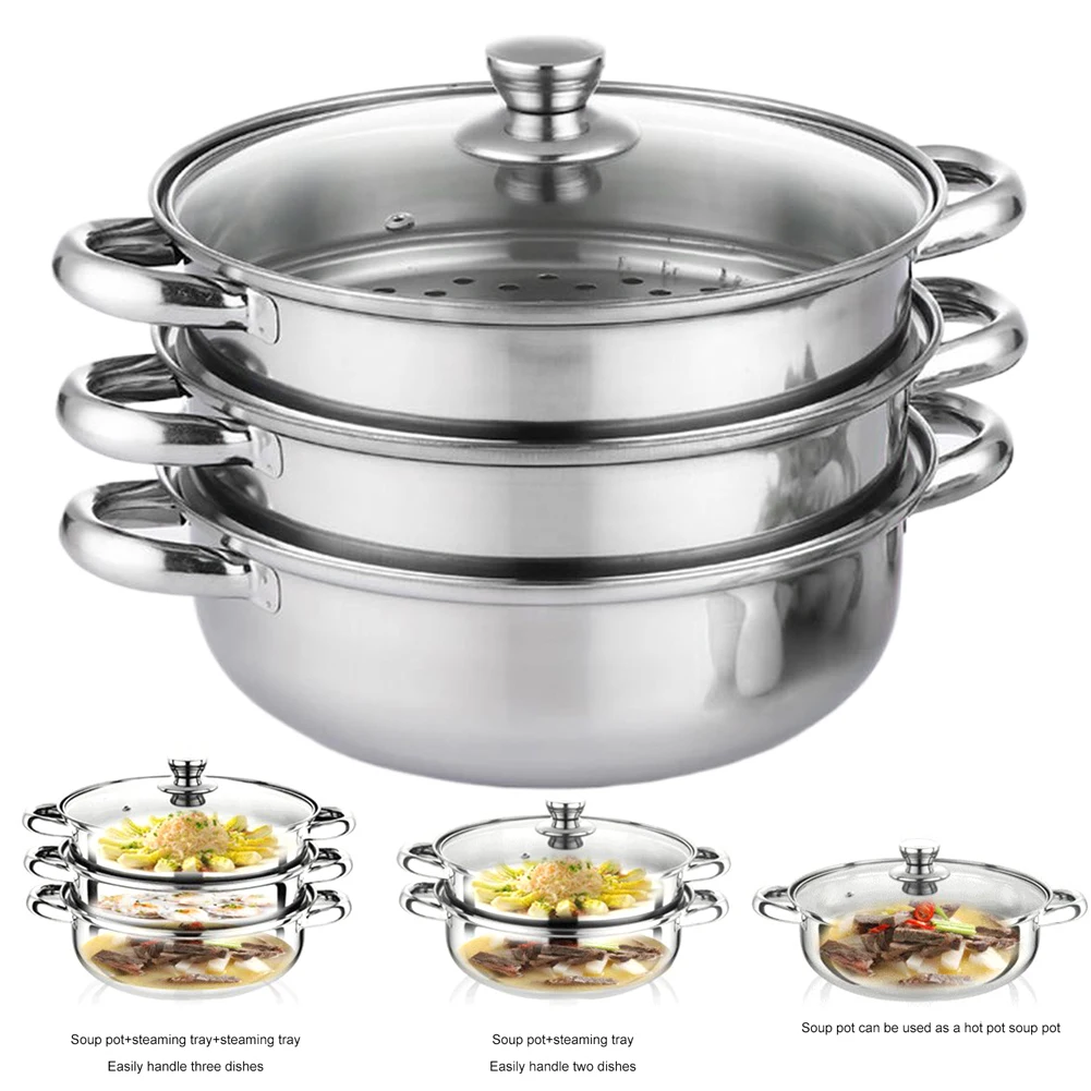 뚜껑이 있는 요리용 3단 찜통 스테인레스 스틸 스팀 포트 야채 만두 스톡 소스 음식용 다용도 찜통