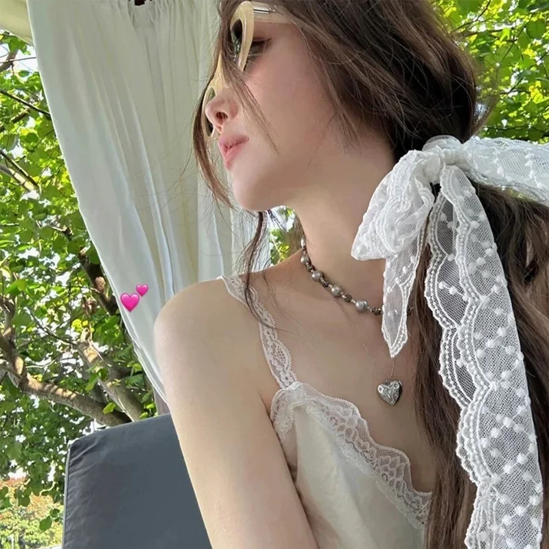 빈티지 화이트 레이스 헤어 스카프 여름 달콤한 활 머리띠 여성을위한 우아한 리본 스카프 Hairbands 130cm 긴 좁은 Neckscarf