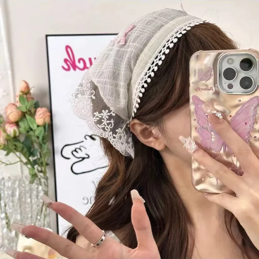 빨간색 짠 격자 무늬 레이스 헤어 스카프 랩 여성 레트로 삼각형 Headscarf 모자 여행 사진 머리띠 소녀 헤어 액세서리