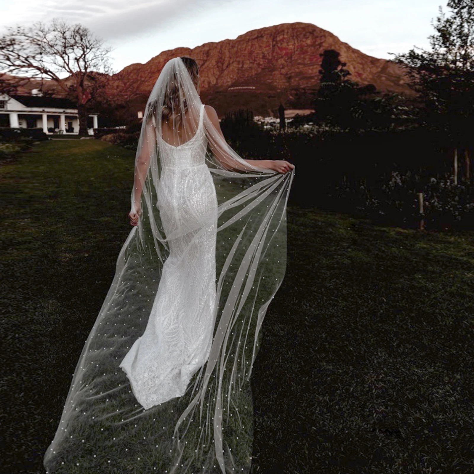 짧은 웨딩 베일은 진주와 비즈로 장식된 섬세한 디자인이 특징이며 어떤 신부 의상에도 우아한 느낌을 더해줍니다.
