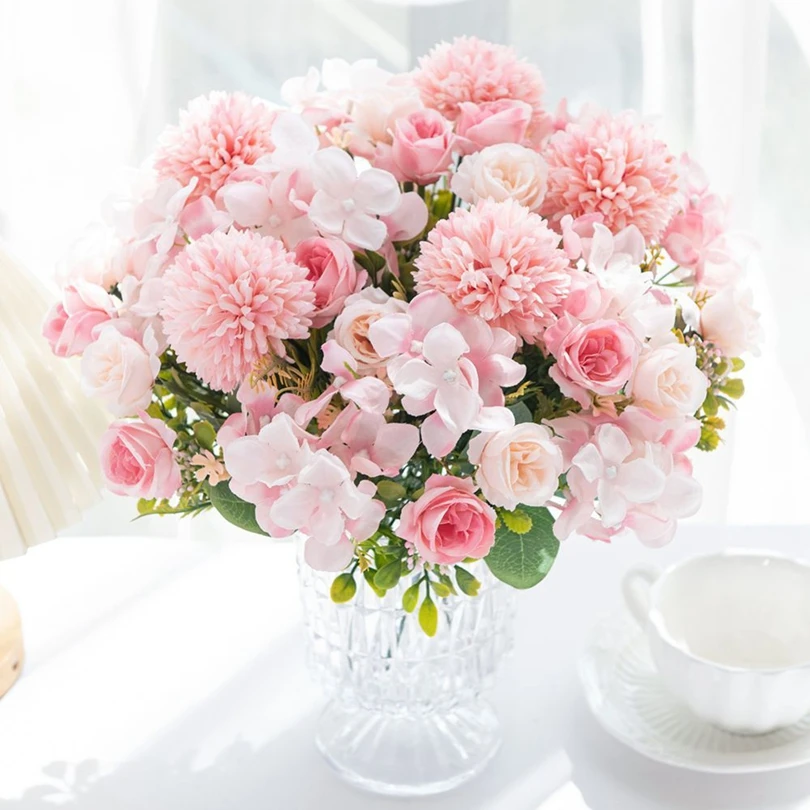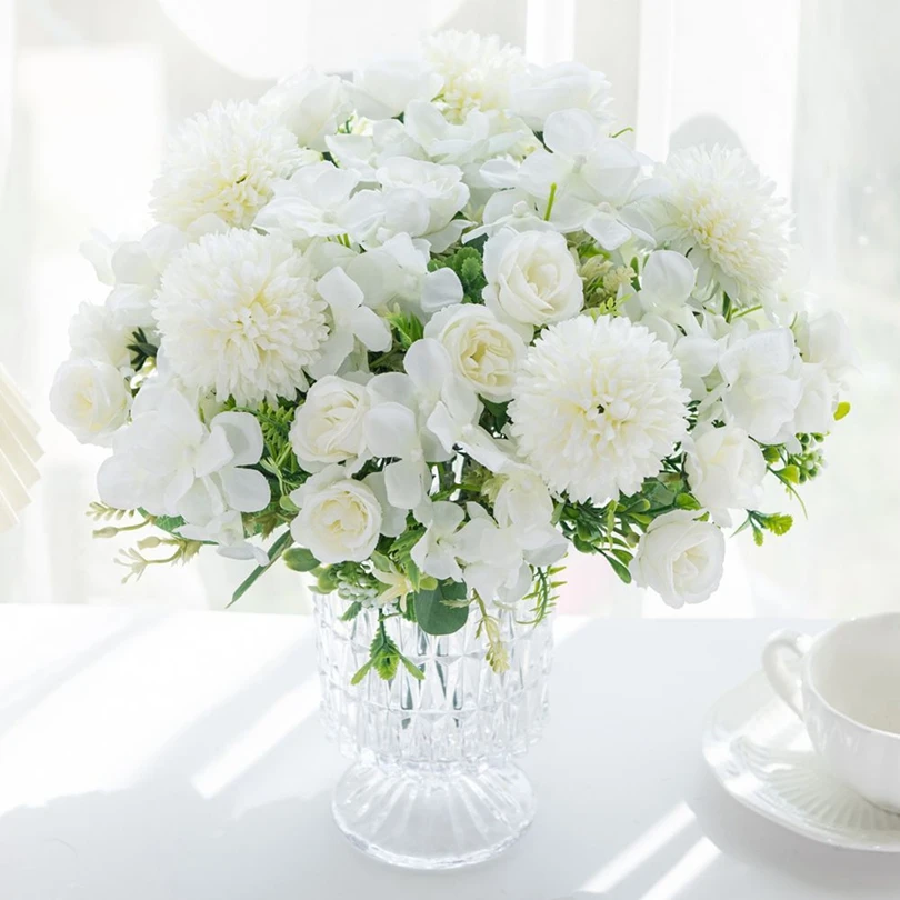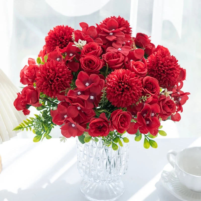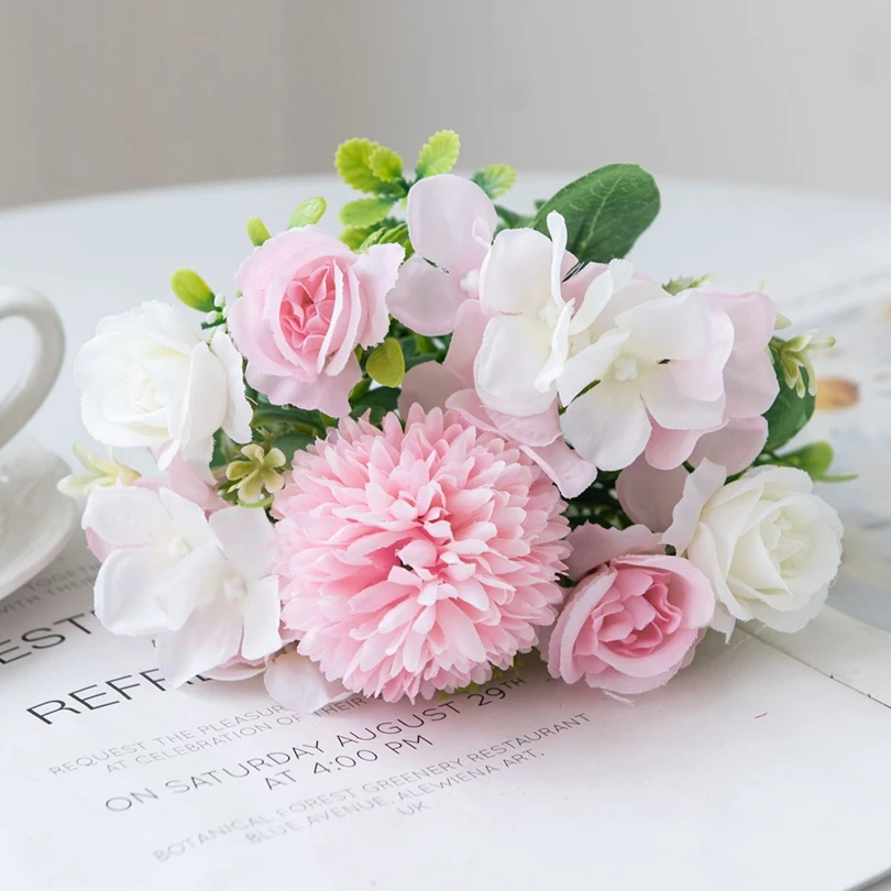 실크 로즈 국화 신부 꽃다발 인공 꽃 결혼식 야외 정원 홈 룸 테이블 장식 화환 DIY 선물 액세서리