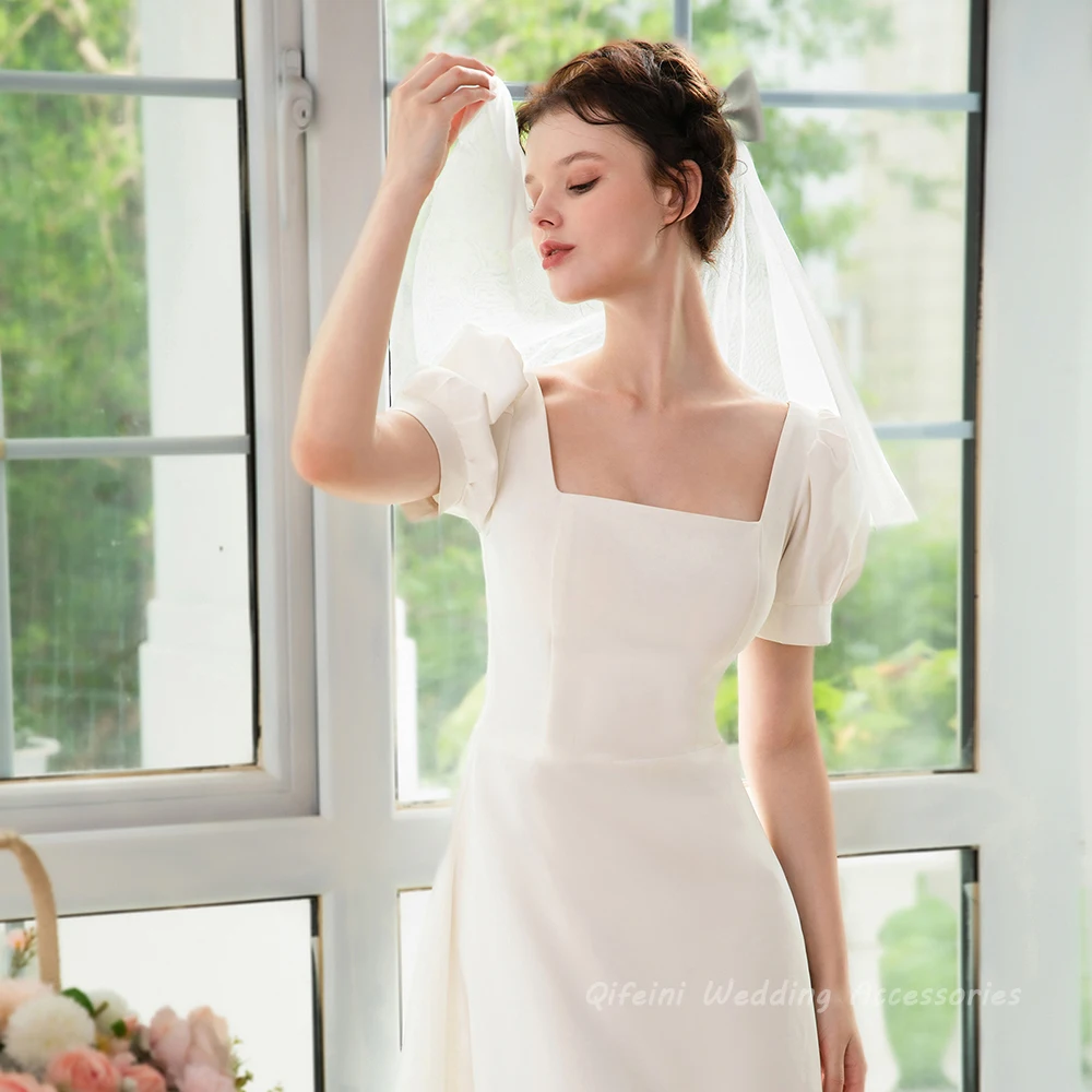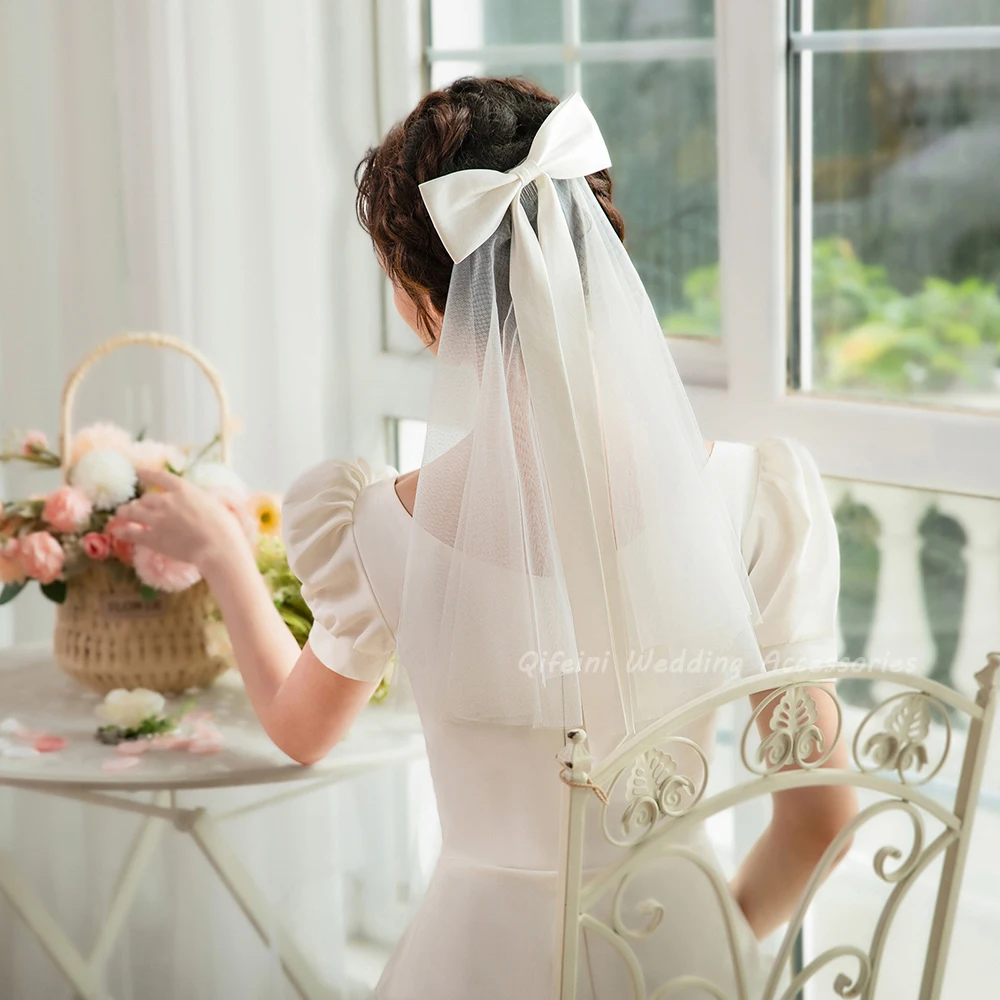 우아한 새틴 리본매듭 짧은 신부 베일 부드러운 얇은 명주 그물 어깨 길이 웨딩 베일 빗 포함