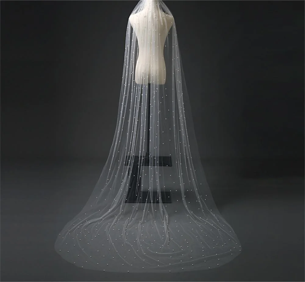진주 신부 베일 소프트 1 계층 신부를위한 파란색 웨딩 베일 빗 웨딩 액세서리와 대성당 길이