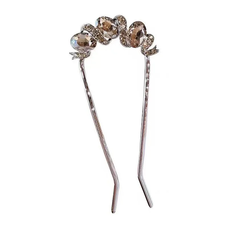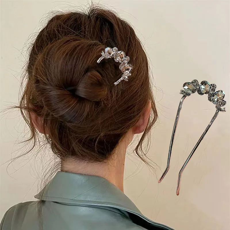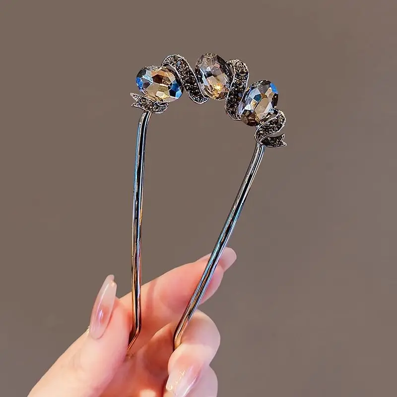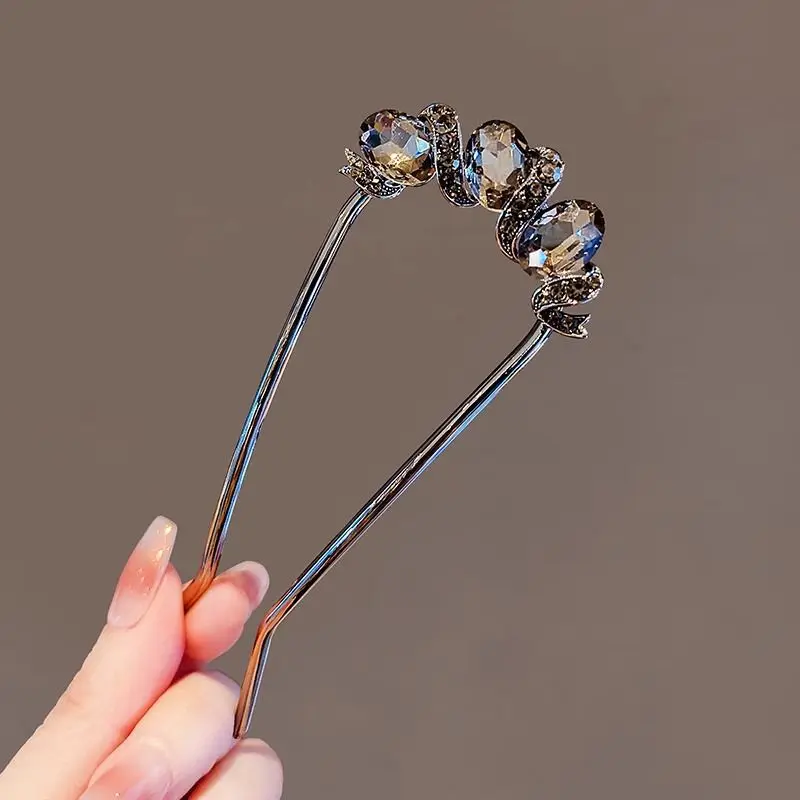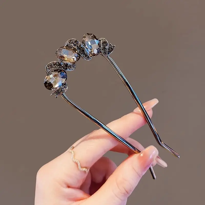 하이 엔드 금속 크리스탈 잎 U 자형 머리핀 여성 간단한 블랙 컬러 라인 석 머리 걸쇠 롤빵 헤어 스틱 헤어 액세서리