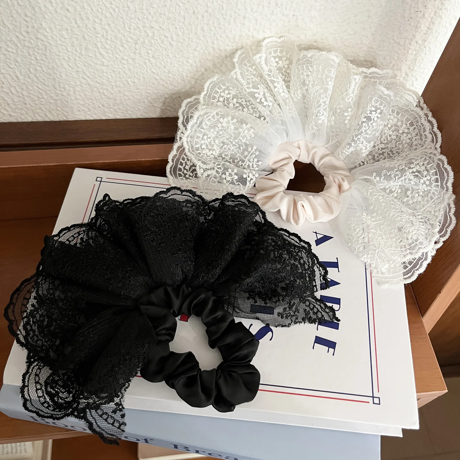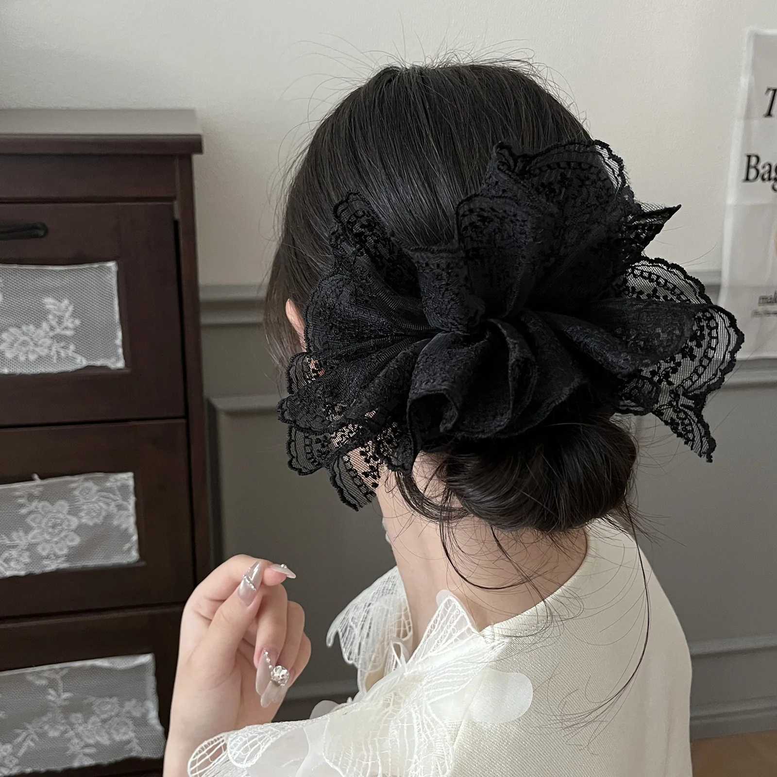 한국 감성 더블 레이어 자수 스커트 레이스 대장 스크런치 헤어플라워, 발레 스타일 포니테일 헤어밴드 1개