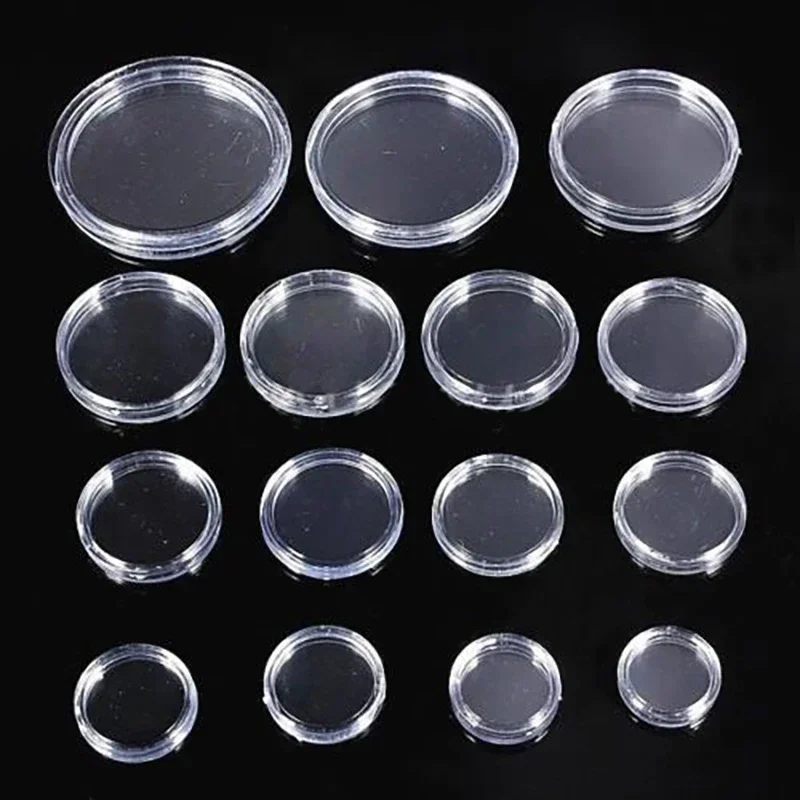 100pcs 창고 번들 16-46mm 투명 플라스틱 동전 홀더 디스플레이 캡슐 컬렉션 케이스 라운드 링 보호 상자
