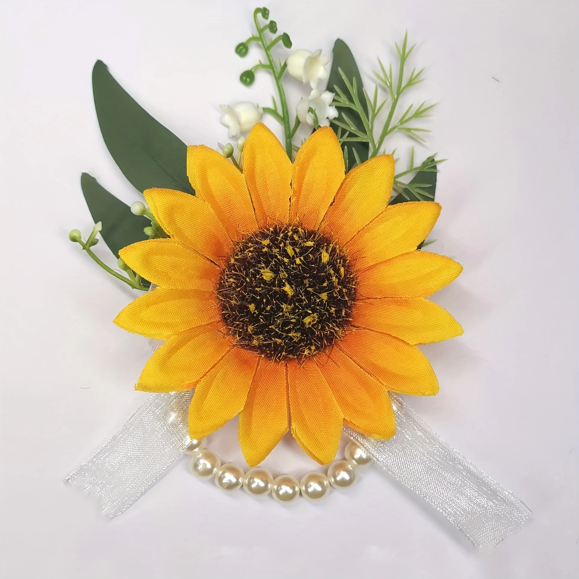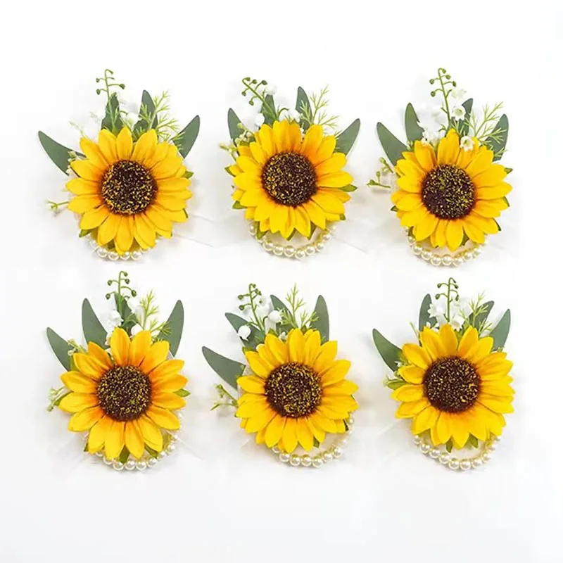 6PCS 해바라기 웨딩 손목 코사지와 Boutonniere 신부 들러리 남자 신랑 레드 로즈 웨딩 꽃 액세서리 세트