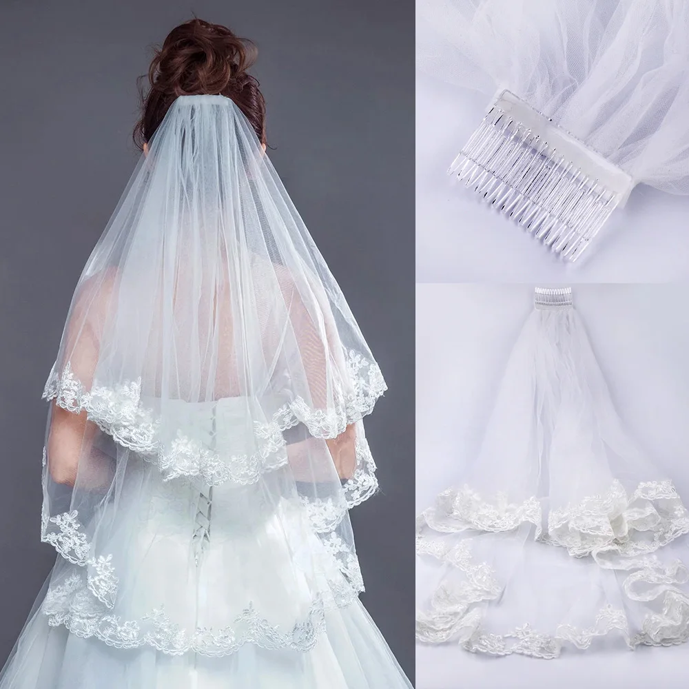 흰색 두 레이어 신부 웨딩 베일 레이스 가장자리 섹시한 짧은 허리 길이 웨딩 베일 신부를위한 빗 드레스 베일